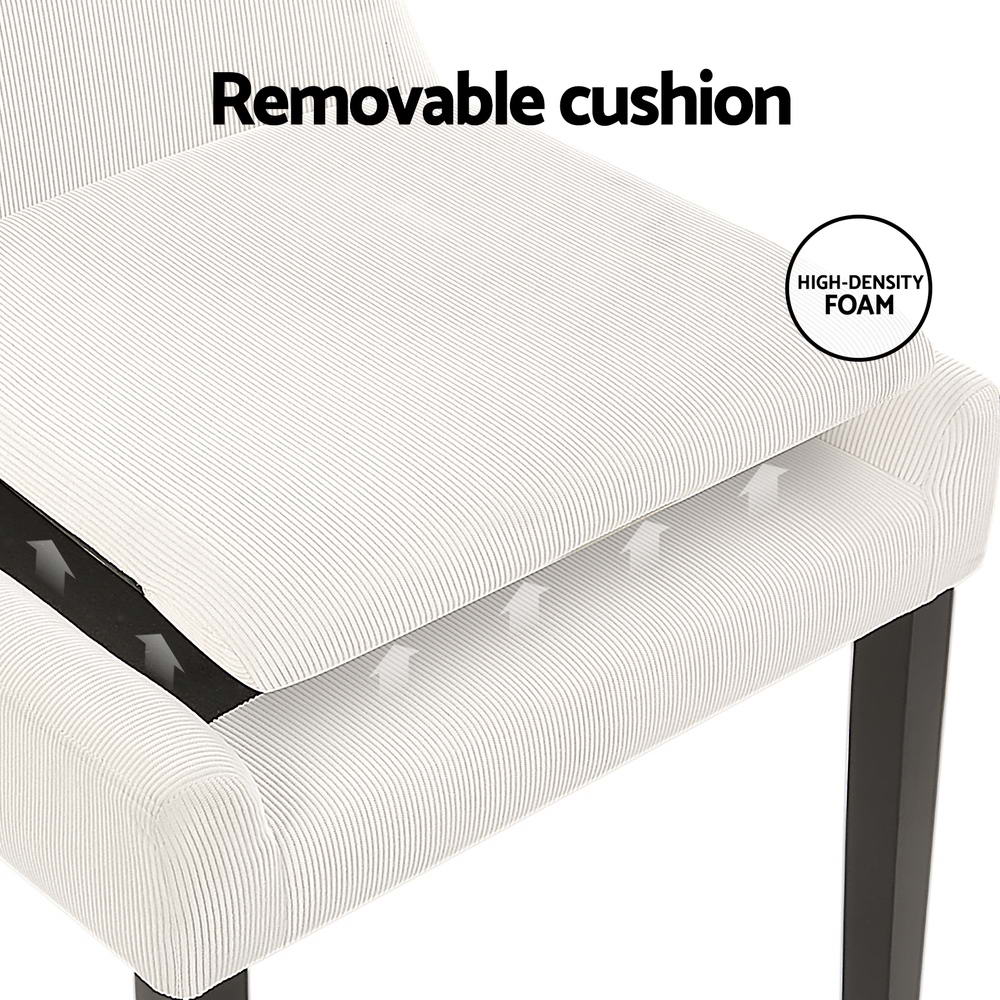 Elevate your dining experience with the Artiss 4-piece Tina Dining Chair Set. Crafted with premium corduroy upholstery, these chairs exude a modern and sophisticated charm. The sturdy rubber wood legs provide stability and durability, ensuring these chairs will stand the test of time. Featuring high-resilience foam, these chairs offer exceptional comfort and support, allowing you to enjoy long meals with family and friends. The anti-slip pads ensure the chairs stay securely in place, providing added safety and peace of mind. With removable cushions, cleaning and maintenance take no time at all, making these chairs a practical choice for any home. Assembly is a breeze, allowing you to enjoy your new dining chairs in no time. Elevate your dining space with our contemporary Artiss Tina Dining Chairs and create a stylish and inviting atmosphere for your guests.